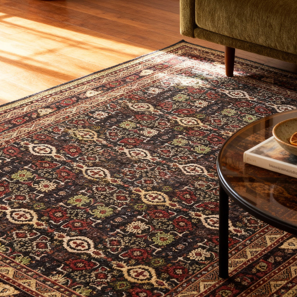 Matta i klassiskt orientmönster. Beroende pÄ hur ljuset faller pÄ luggriktningen sÄ kan fÀrgerna skifta i fÀrgstyrka vilket ger mattan ett levande utseende. Eftersom mattan Àr gjord av tunna polyestertrÄdar, som pÄminner om silke, sÄ har mattan en fin lyster och Àr Àven vÀldigt mjuk.