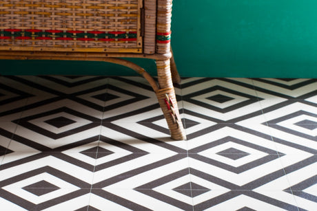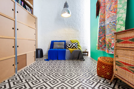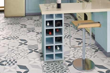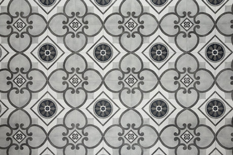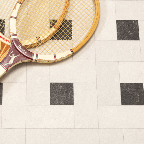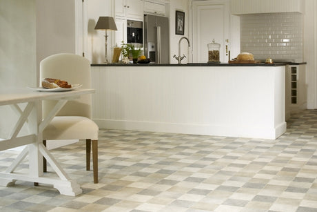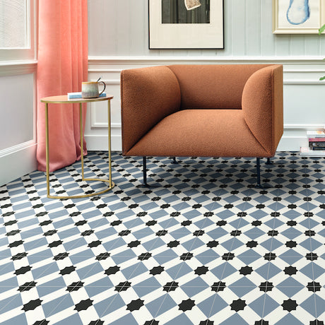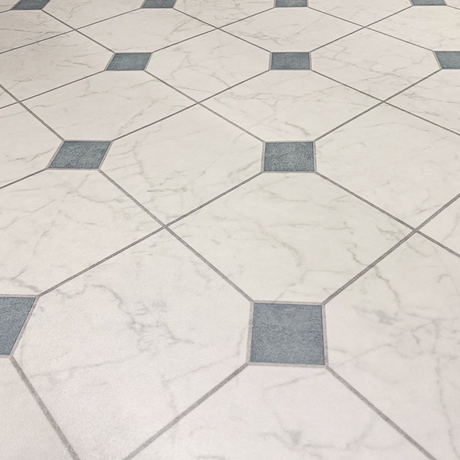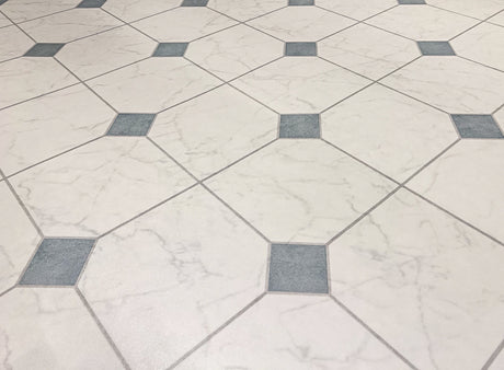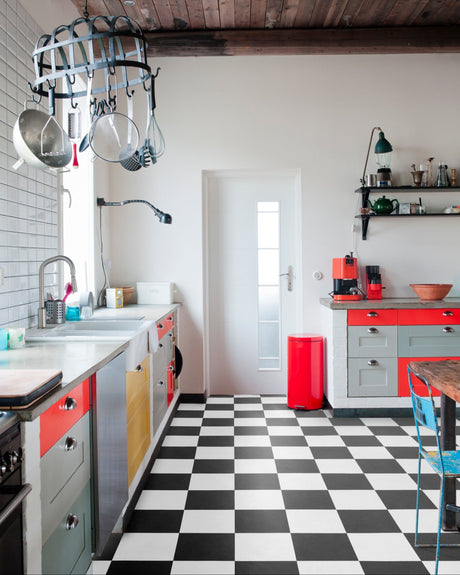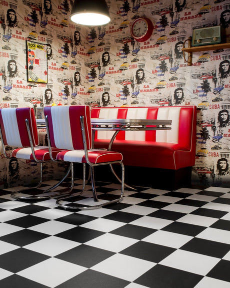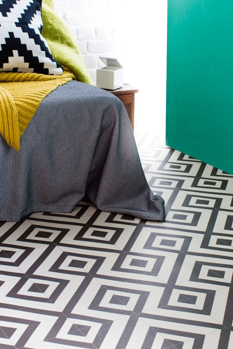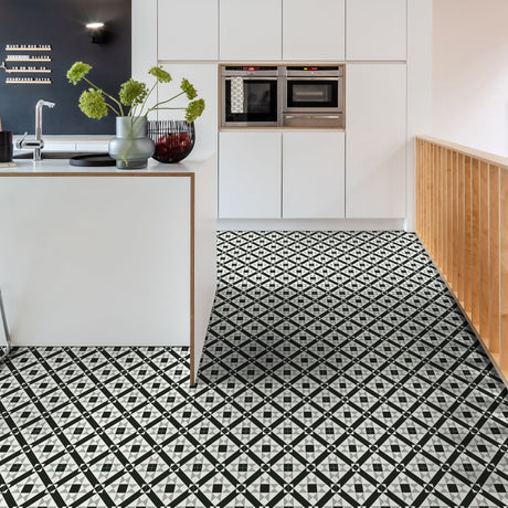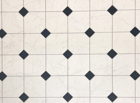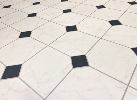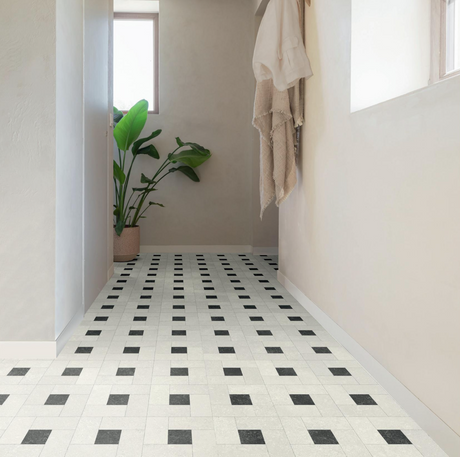 Vinylgolv i populÀr svart/vit rutdesign. 300 cm bredd.