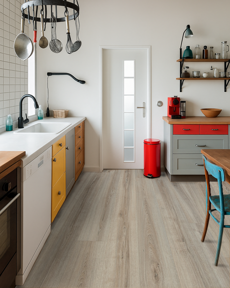Högkvalitativt plastgolv i stilrent ekmönster. 300 cm bredd.